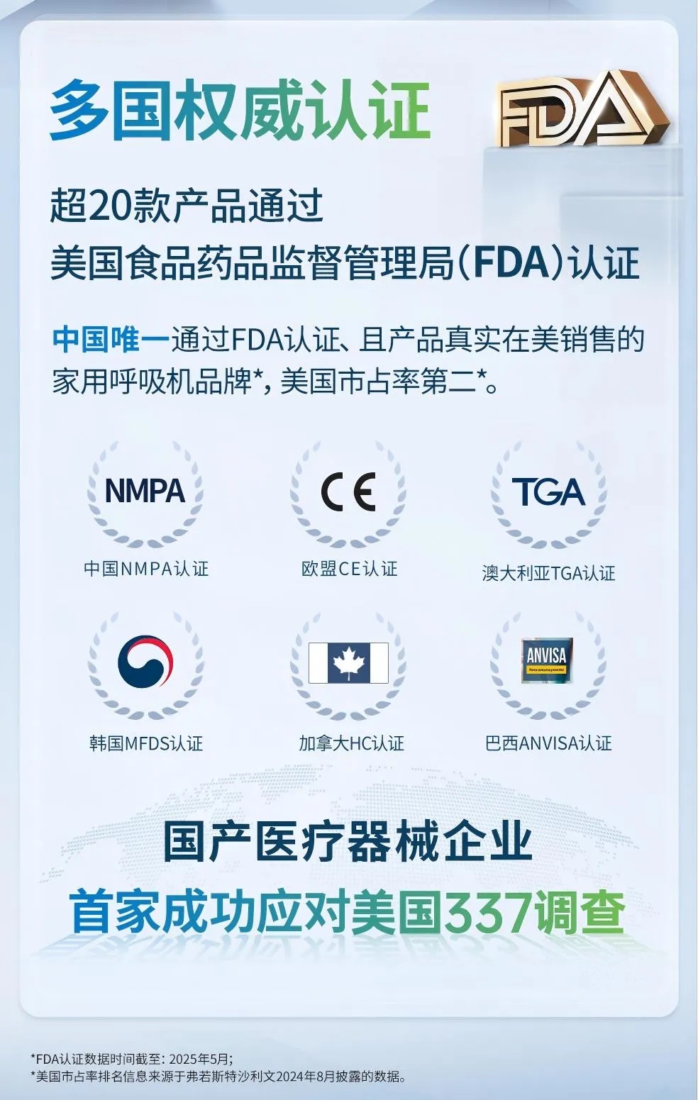 事實(shí)上,瑞邁特的全球化布局啟動(dòng)得很早,在2008年就取得了歐盟CE認(rèn)證,并2012年獲得美國(guó)FDA認(rèn)證,成為目前僅有的一家在美國(guó)銷售的中國(guó)家用呼吸機(jī)企業(yè),并在2023年美國(guó)市場(chǎng)銷售占有率達(dá)到第二位,在全球這一廣闊空間中,獲得歐美等發(fā)達(dá)國(guó)家市場(chǎng)的廣泛認(rèn)可,產(chǎn)品技術(shù)力得到進(jìn)一步淬煉。