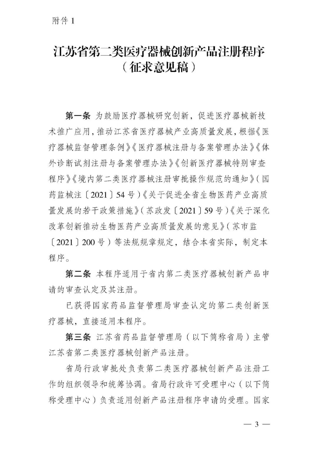 關于《江蘇省第二類醫(yī)療器械創(chuàng)新產品注冊程序》(征求意見稿)等3個程序公開征求意見建議的公告