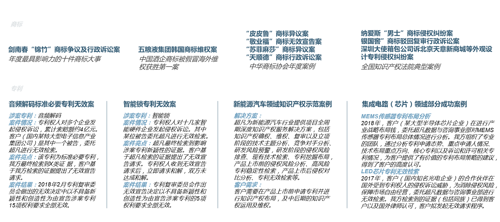 超凡擁有國內(nèi)綜合型知識(shí)產(chǎn)權(quán)專家團(tuán)隊(duì),專利代理人/工程師、律師、咨詢師、商標(biāo)代理人等各類專家800余人,其中包括清華、北大、中科院博士在內(nèi)的100余名多技術(shù)領(lǐng)域檢索咨詢專家團(tuán)隊(duì),其成員大多具有10余年從業(yè)經(jīng)驗(yàn),全國專利信息人才6名;專利代理人/工程師440余人,而且50多人具有律師及專利代理人雙重資格、海外留學(xué)背景或?qū)彶榻?jīng)驗(yàn);超凡專家團(tuán)隊(duì)中,還包括亞洲知識(shí)產(chǎn)權(quán)專家、北京市十佳專利代理人等。 隨著專業(yè)化建設(shè)的不斷深入,超凡憑借深厚的實(shí)務(wù)經(jīng)驗(yàn)及卓越的服務(wù)品質(zhì),鑄就了多項(xiàng)典型案例,如成功代理的倍受社會(huì)各界關(guān)注、涉及37個(gè)異議主體、有史以來涉案主體數(shù)量最多的“國酒茅臺(tái)”商標(biāo)異議案,“拉桿箱”外觀設(shè)計(jì)專利權(quán)糾紛、“男士”商標(biāo)侵權(quán)糾紛等案件入選全國法院知識(shí)產(chǎn)權(quán)典型案例或?qū)@麖?fù)審委典型案例。同時(shí),超凡不斷強(qiáng)化學(xué)術(shù)建設(shè),把理論研究作為“深化專業(yè)化”的有力支撐。在上海知識(shí)產(chǎn)權(quán)研究所發(fā)布的“2016年度知識(shí)產(chǎn)權(quán)專業(yè)文章發(fā)表排行榜”中,超凡發(fā)表專業(yè)文章數(shù)量在社會(huì)組織機(jī)構(gòu)中排名第一。